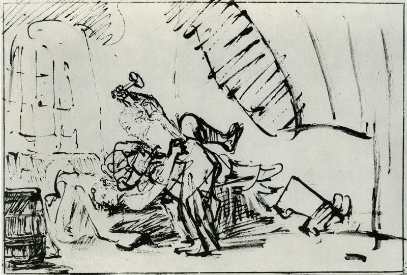 In this drawing, Rembrandt chose the moment of extreme violence, that of Jael knocking a nail into the head of the sleeping Sisera. Jael has already delivered a terrible blow, the nail is deep inside Sisera's head, his face is twisted with agony, while the unrelenting Jael raises her arm in order to bring the hammer crashing down yet again on Sisera's shattered skull.